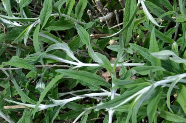 In this climate, Mexican Sage never really dies – it shrinks, to be sure, and the stems get woody, but there are only a few days during the year that the pretty little purple velvet flowers aren’t out seducing bees. I tried a few times to give it a haircut, but, like all children, it HATES haircuts, and it managed to sweet talk me out of it every time. However, this is something that really needs to be done. I started the job a few weeks ago, and I’ve been chipping away at it whenever I had a spare moment.