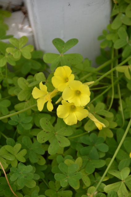 Oxalis aka Sour Grass aka Bermuda ButtercupThis is also a volunteer in our garden, and it propagates via tubers underground. This is IMPOSSIBLE to get rid of without using chemical poisons, so we have it everywhere. It comes up annually in late Winter and stays through most of the Spring. If you pick the flower by the stem, you can chew on the stem for a sour taste that some folks love and some really don’t. Be careful when picking them because they are frequently targets for the dogs that walk by each day, so you might want to wash them off before chewing. I don’t encourage folks to swallow the stems because I don’t know if they’ll give you a tummy ache. |